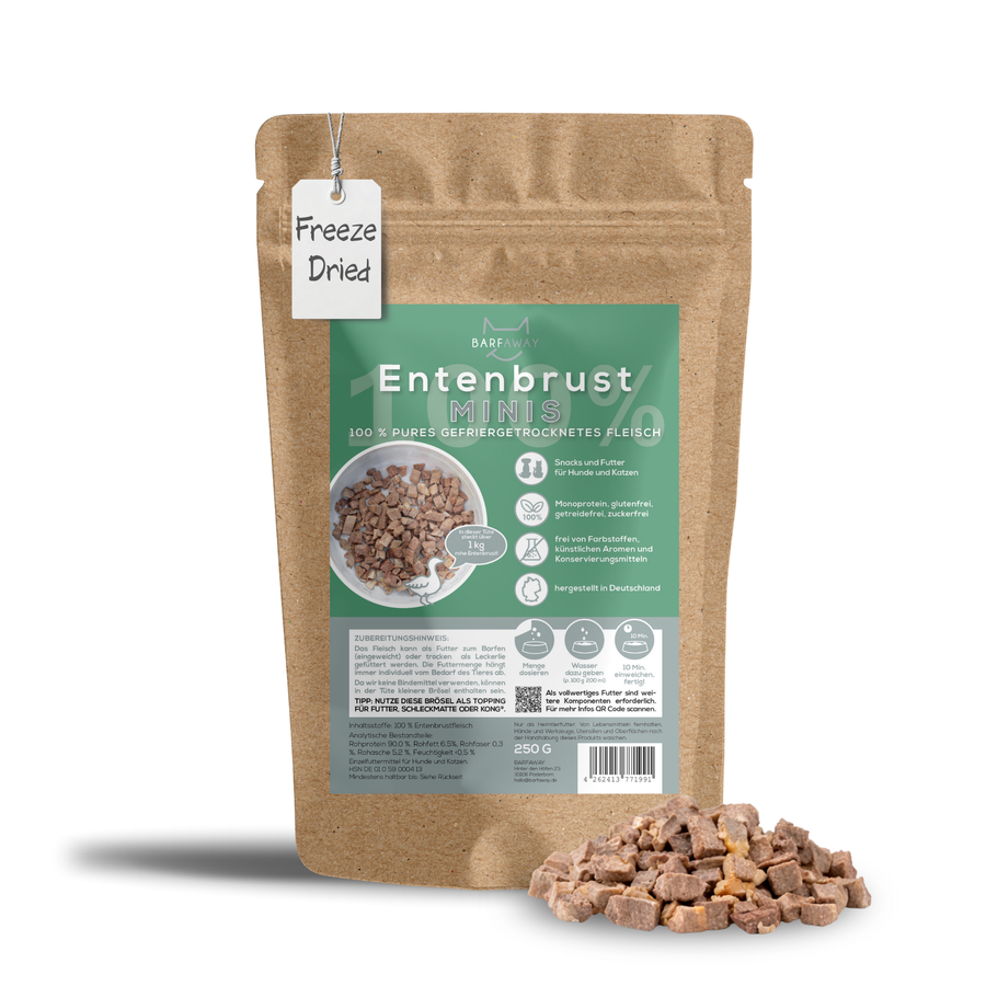 Warum BARFaway? Gefriergetrocknete Snacks erhalten die wertvollen Nährstoffe und den natürlichen Geschmack des Fleisches – ideal für eine artgerechte Ernährung. Ob als Belohnung oder gesunde Ergänzung zur täglichen Futterration: Deine Katze wird es lieben!