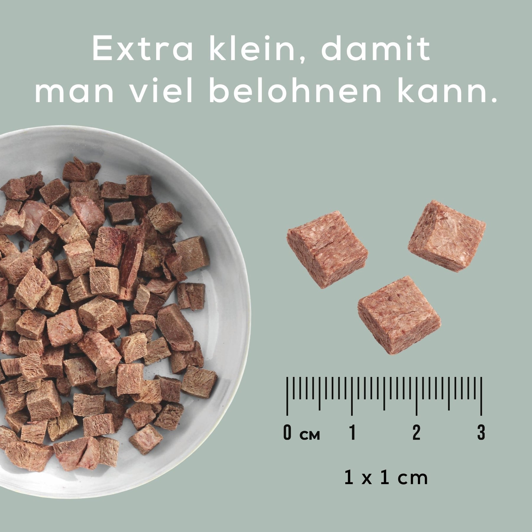 Die Würfel können flexibel gefüttert werden: trocken als herzhafter Snack oder mit Wasser rehydriert als saftige BARF-Ergänzung. 100 g ergeben eingeweicht etwa 430 g Frischfleisch. Monoprotein, getreidefrei und zuckerfrei. Hergestellt in Deutschland – Premium-Qualität ohne Kompromisse.