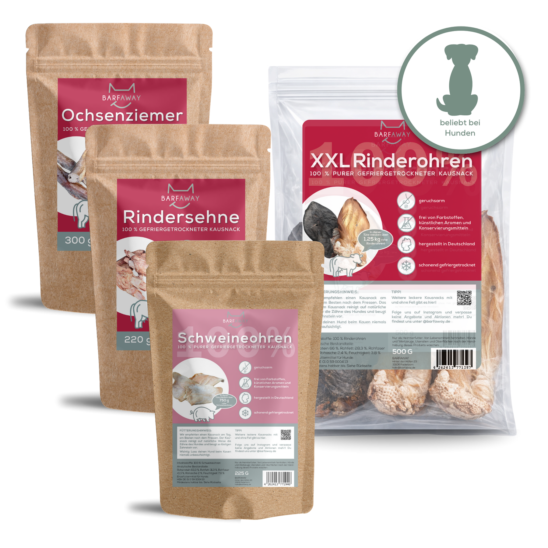 Die gefriergetrockneten Kauartikel sind sehr gut verträglich, auch für empfindliche Hunde. Da uns das Tierwohl sehr wichtig ist, beziehen wir unsere Produkte fast ausschließlich von regionalen Höfen und stellen unsere Produkte in Deutschland her.